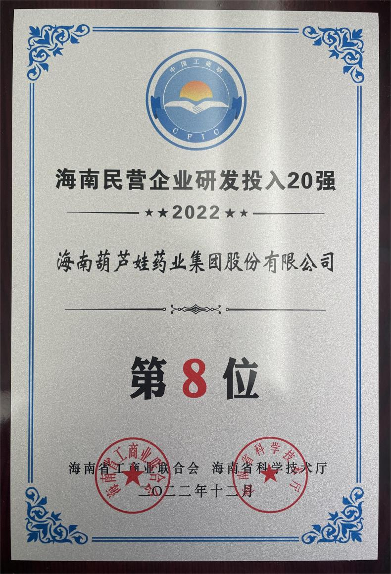 12月23日,2022海南民营企业50强和研发投入20强发布会在海口举行。会上发布了“2022海南民营企业50强”“2022海南民营企业研发投入20强”榜单和分析报告。k1体育药业再次荣登两榜,在海南民营企业50强榜单中位列第25位,较去年上升8位,这也是公司连续三年登榜;在海南民营企业研发投入20强中位列第8位,较去年上升7位。